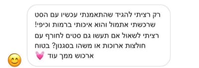 2. משלוח עד הבית בתוספת 20 ש"ח בלבד, אנא תהיי זמינה יתכן כי תקבלי שיחה מהשליח.